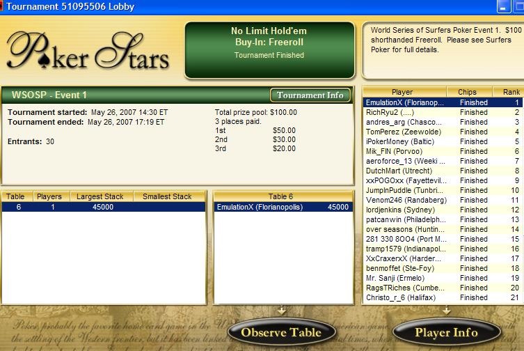 There has been loads of events on Surfers Poker over the years. Some of the popular events are the WSOSP (World Series of Surfers Poker), Sharkfin, Poker After Dark, Survivor, SNG Championship, Deepest Finish Contests, MMC Contests, Pro Tour, etc, etc. We did over 1400 events/contests in total. Scroll down to the bottom for a fuller list.