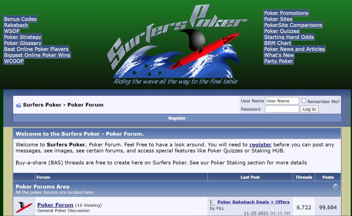Welcome to Surfers Poker. We are an online poker community that opened in 2007 and has been online ever since.